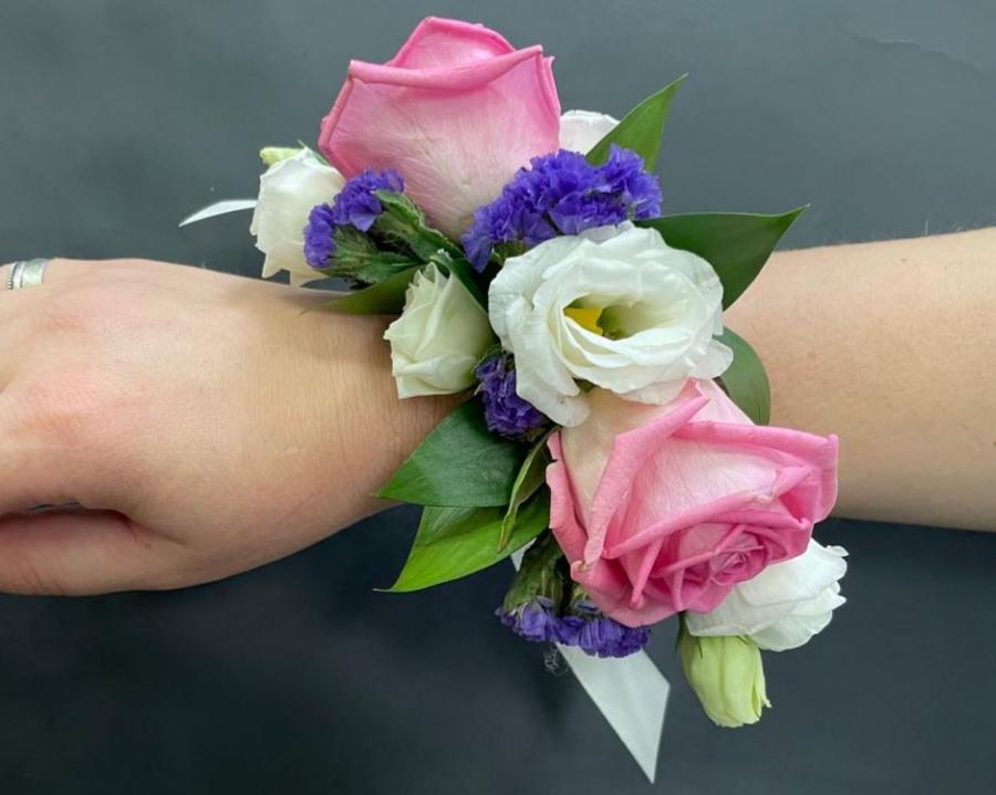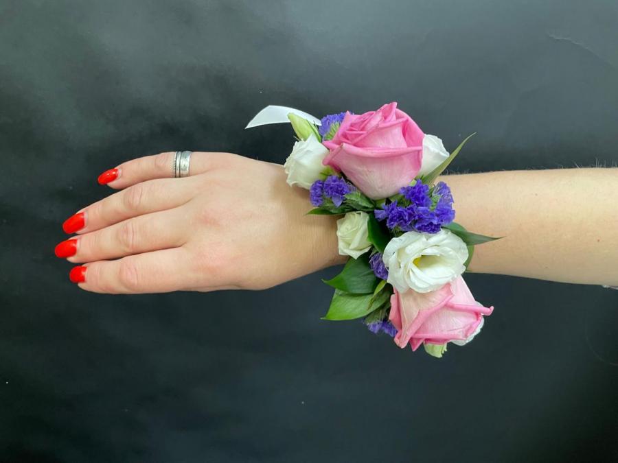 2025г. Браслет на руку невесты из живых цветов. Состав: Роза, эустома, статица, зелень. Цвет: Бело розовый с синим. Размер (15х3х2)