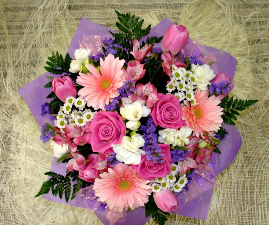 2010г. Букет из живых цветов круглый. Состав: Герберы, тюльпаны, розы, хризантема. Цвет: Малиново-розовый. Сборный букет