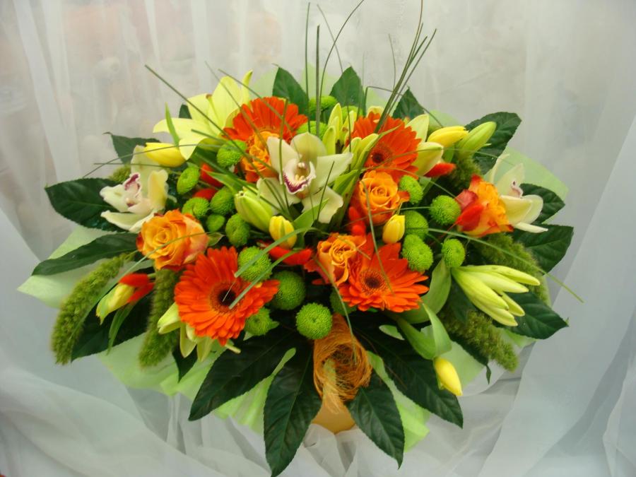 2012г. Букет из цветов. Контрастный яркий букет, символизирующий процветание и удачу – хороший выбор для руководителей, причем как для мужчин, так и для женщин, вполне уместен он на юбилее, серебряной свадьбе, официальном торжестве, связанном с чествованием заслуг артистов, спортсменов, деятелей науки. Состав: тюльпаны, лилии, розы, орхидеи цимбидиум, герберы, хризантемы, сетария, берграсс, листья аралии. Цвет: Желтый, оранжевый, салатовый, зеленый, темно-зеленый. Размер (40х55х65). нц