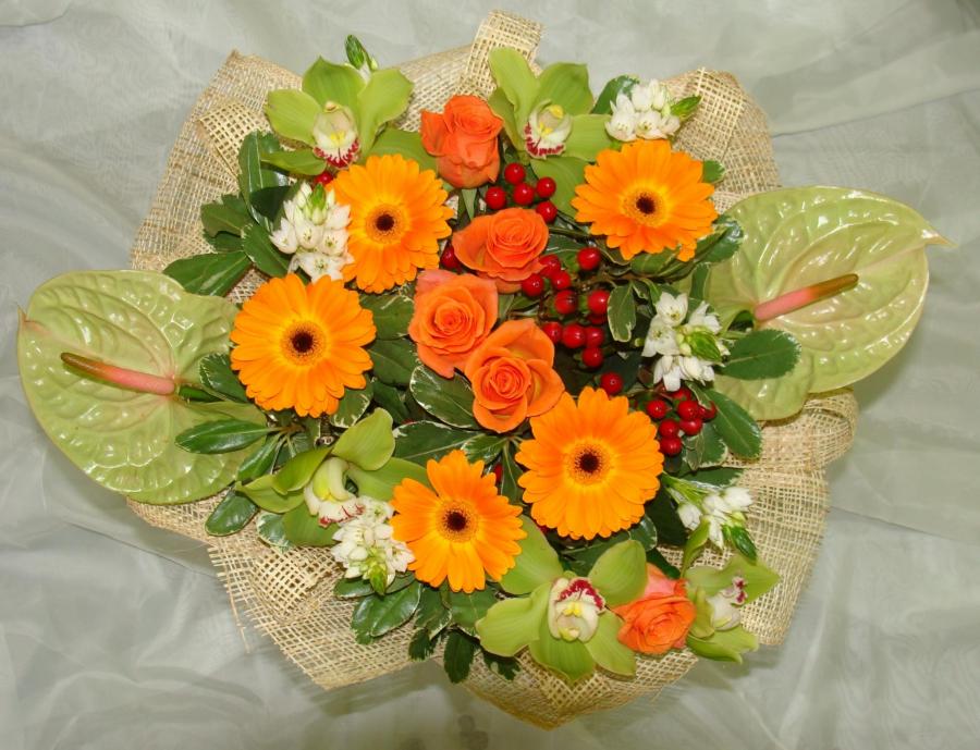 Букет овальный. В оранжево-зеленых тонах. Сборный букет