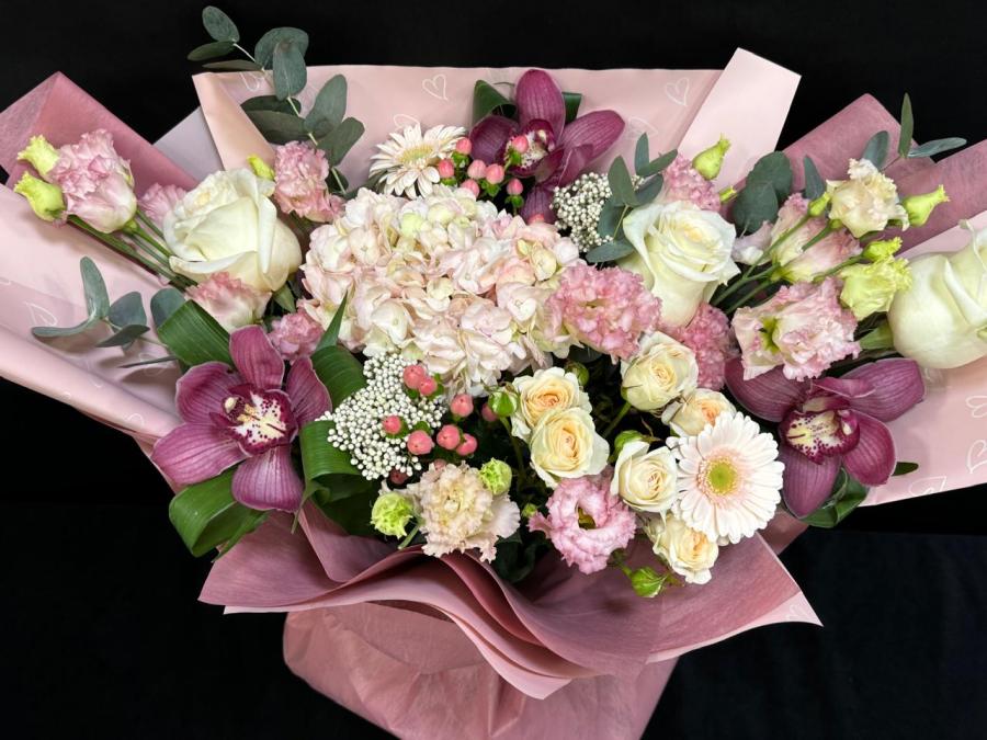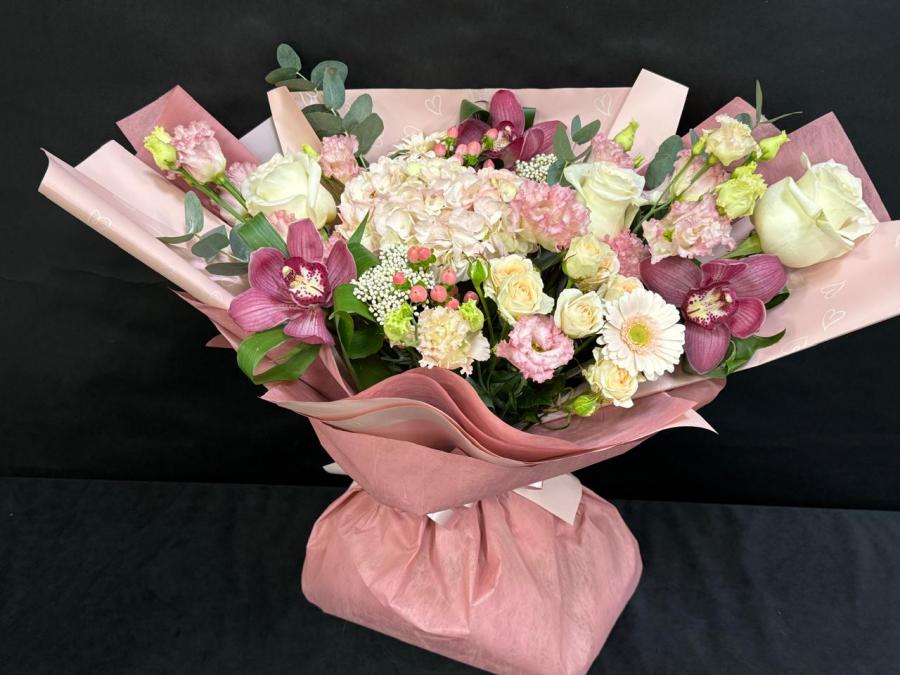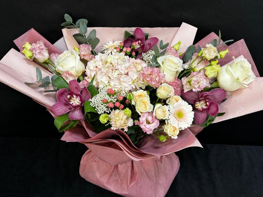 2025г. Букет из живых цветов. Матери, любимой. Форма овальная, бабочка. Состав: Гортензия, гербера, орхидея, роза, роза кустовая, эустома, озатамус, аспедистра, эвкалипт. Цвет: Розовый, белый, кремовый. Размер (60х35х55)