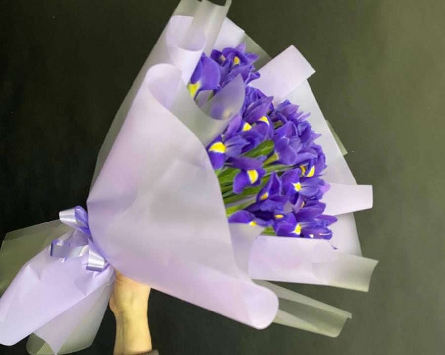 2025г. Букет из живых цветов. Форма круглая. Состав: 15 ирисов. Цвет: Синий. Размер (34х34х60)