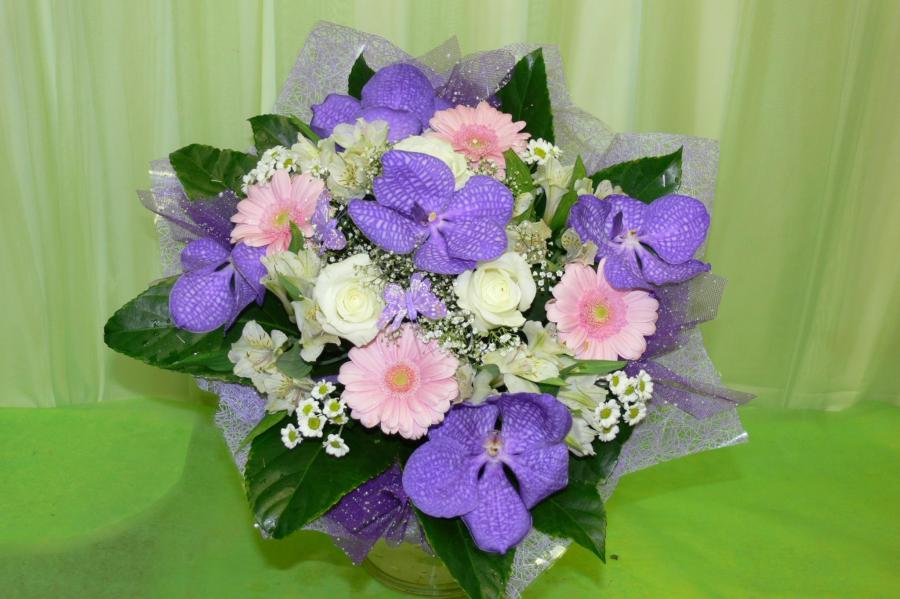 2012г. Букет из живых цветов. Состав: Гербера, орхидея ванда. Цвет: Розово-сиреневый. Размер (35х35х35) нц 2015