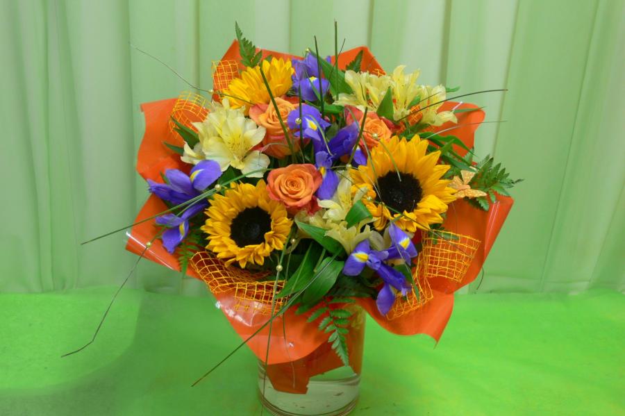 2010г. Букет из живых цветов круглый. В оранжево-синих тонах. Сборный букет