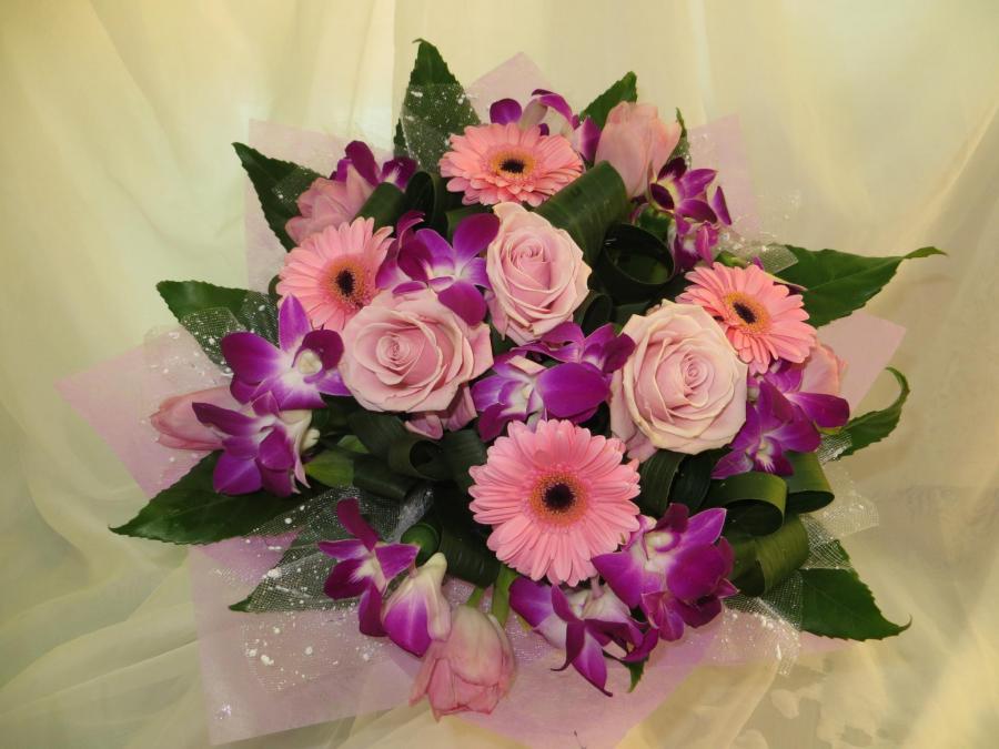 2013г. Букет из живых цветов. Состав: Роза, гербера, дендробиум. Цвет: Сиренево-розовый. Размер (35х35х40)