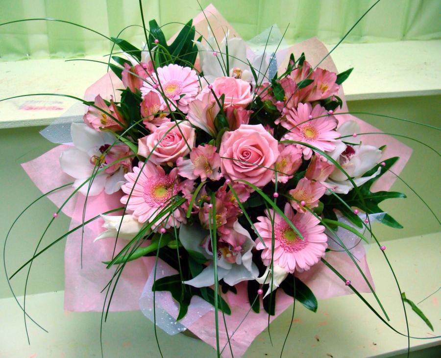 2010г. Букет из живых цветов. Круглый. Цветы маме ко дню рождения. Состав: Гербера, роза, орхидея, тюльпаны. Цвет: Розовый. Размер (35х35х55)