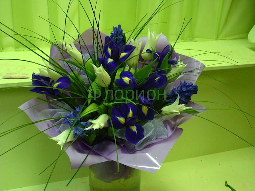 2010г. Букет из живых цветов круглый. В сини-белых тонах. Состав: Ирисы, тюльпаны. Размер (35х35х50). Сборный букет нц 2015