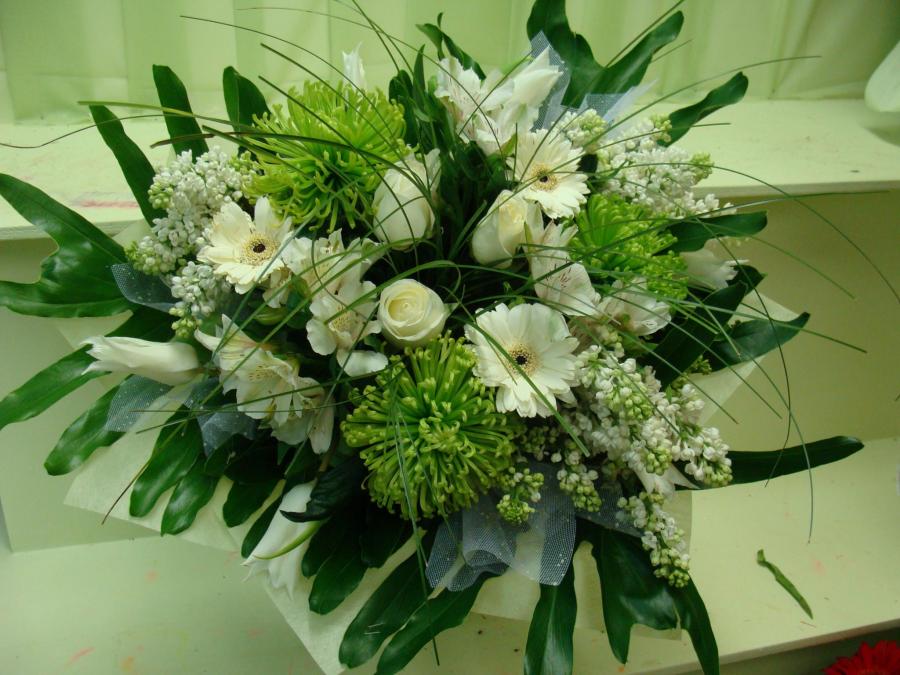 2010г. Букет из живых цветов каскадный. Для счастливой встречи новорожденного. Дорогому малышу на радость. Состав: Герберы, роза, сирень. Цвет: Кремово-зеленый. Размер (35х45х45) нц 2015