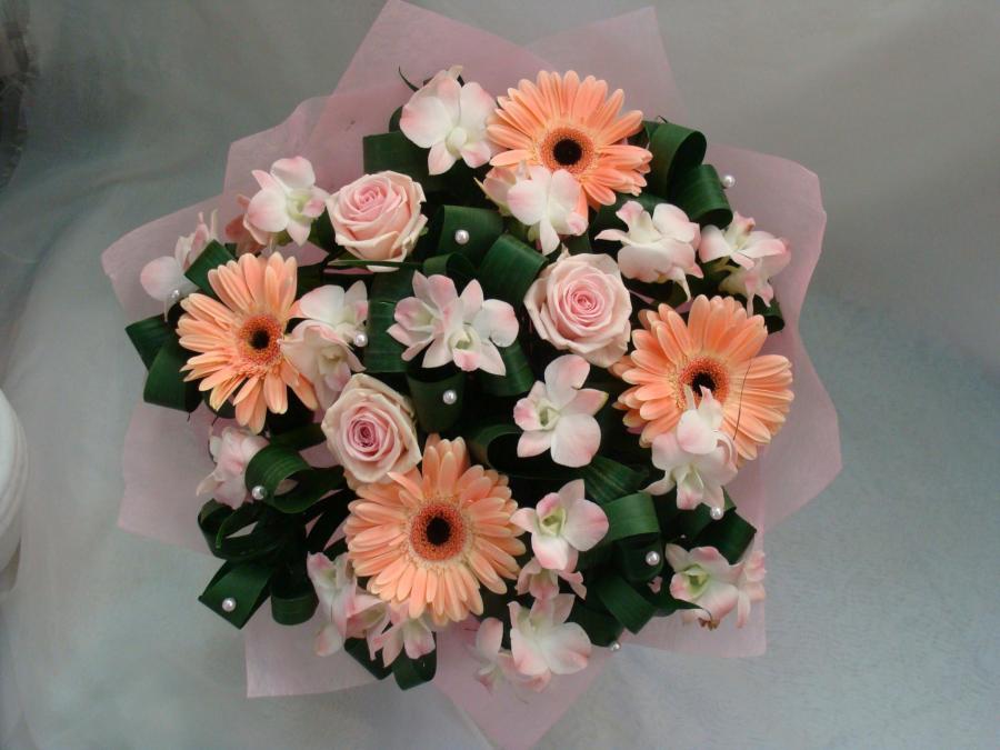 2012г. Букет из живых цветов круглый. Состав: Герберы, розы, орхидея. Цвет: В кремово-розовых тонах. Евро букет