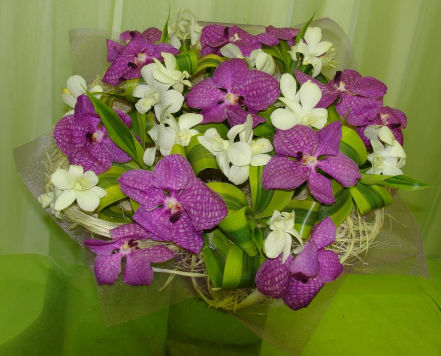 2010г. Букет из живых цветов. Состав: Орхидея ванда, дендробиум. Цвет: Бело-фиолетовый. Размер (35х35х50)