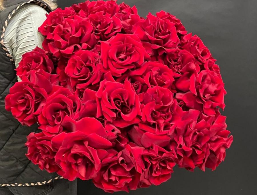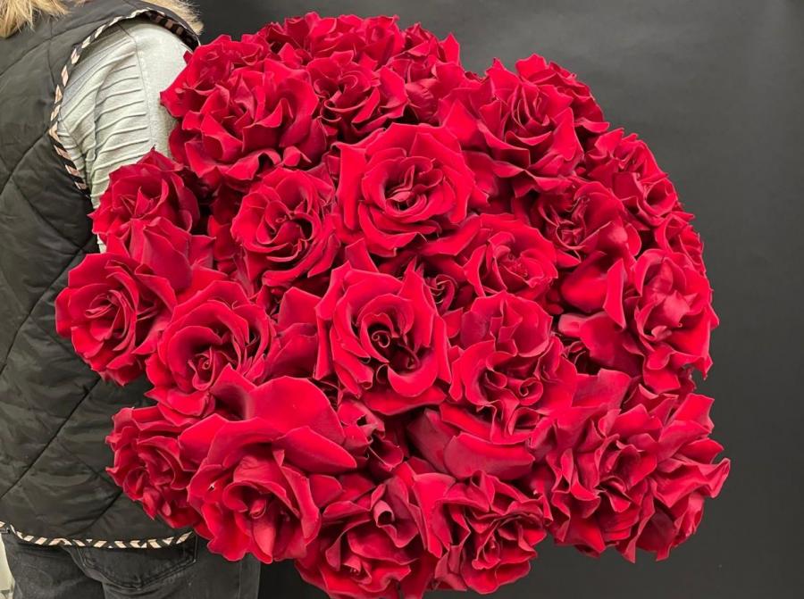 2025г. Монобукет роз. Форма овальная. На день рождения. Цветы кому: Любимой, девушке, маме, .... Состав: 43 розы Готча. Размет (85х50х60) Цвет: вишнево-малиновый