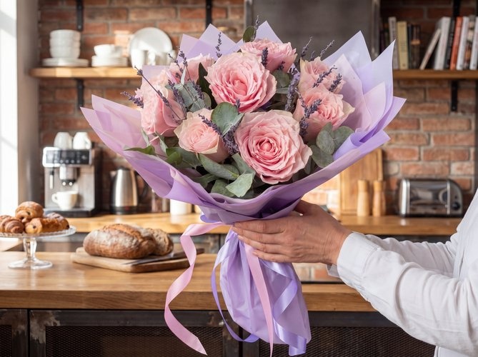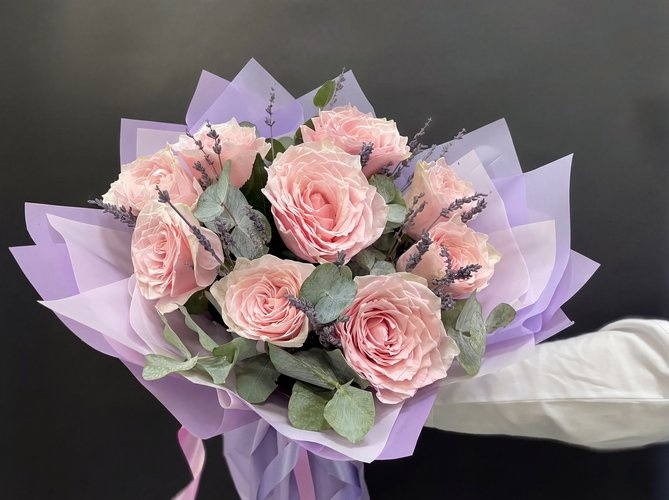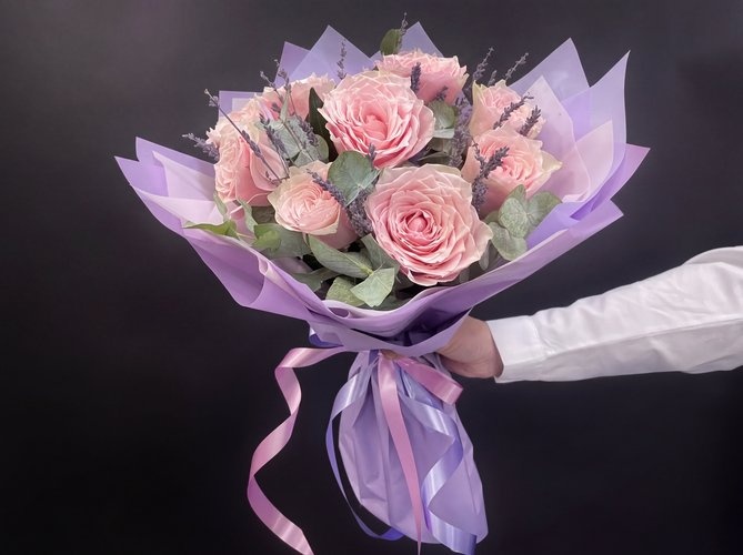 2026г. Букет цветов. Форма: круглая. Состав: розы, лаванда, эвкалипт. Цвет: Розово-сиреневый. Ароматная композиция из роз, свежей лаванды, эвкалипта. Создаёт эффект расслабления и подходит для спальни или зоны отдыха, помогает снять стресс и украшает дом естественной красотой. Это букет, который успокаивает сердце и будоражит душу. «Лавандовый сон» — союз страстной нежности и безмятежной свежести. Ярко-нежная роза говорит о трепетном чувстве, лаванда окутывает уютом и ароматом южной ночи, а эвкалипт добавляет лёгкости и прохлады. Каждый цветок словно создан для того, чтобы вы замедлились и почувствовали главное.Букет шепчет: «Ты — мой сладкий сон, от которого не хочется просыпаться». Он для тех, кто ценит не только красоту, но и глубокую чувственность, для романтиков с тонкой душой. Подходит для свидания при свечах — создаст атмосферу уюта и близости, на годовщину знакомства — напомнить о том, как всё начиналось, для подарка любимой в спальню — поставить у кровати, чтобы каждое утро начиналось с нежности, на день рождения творческой натуры — для художниц, музыкантов, поэтесс, просто в знак тихой благодарности — сказать «спасибо, что ты есть» без лишних слов.