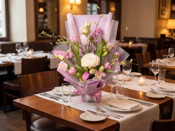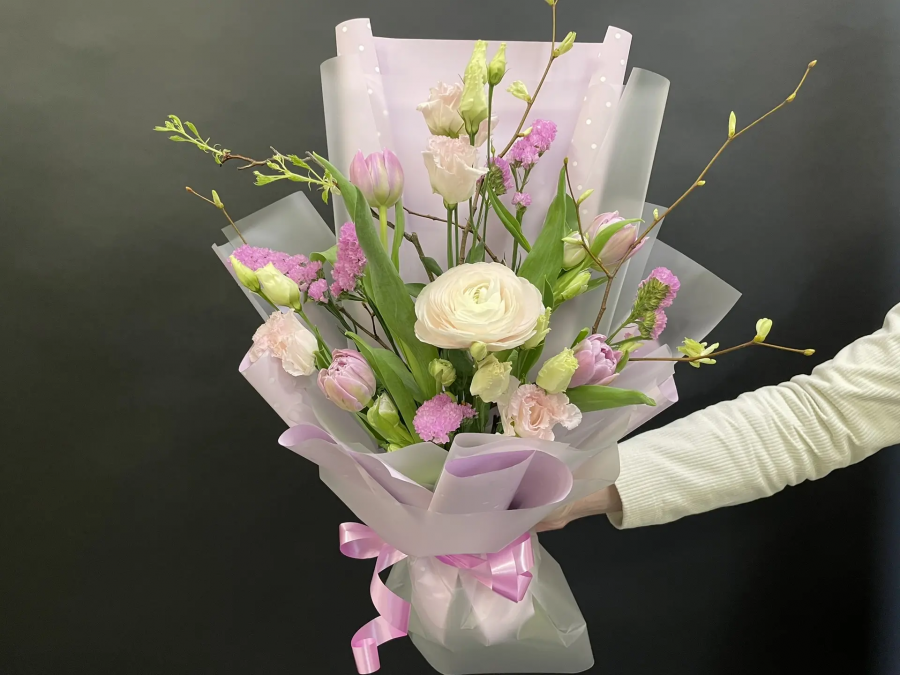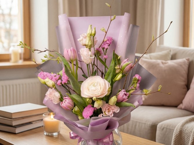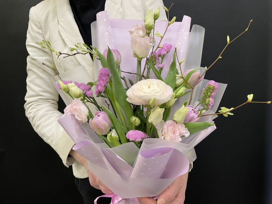 2026г. Букет цветов. Форма: вертикальная. Состав: ранункулюс, тюльпаны, эустома, веточки, статица. Цвет: Бело-сиреневый. Букет «Мгновения весны» — это цветочная история в пастельной гамме, которая подходит как для подарков близким, так и для сезонного украшения торжественных мероприятий или офисных помещений. В основе образа лежит чистый белый цвет ранункулюса, сдержанный молочно-розоватые оттенки эустомы и ярко-розовые акценты статицы, создающими волнующую, воздушную атмосферу. Такая цветочная комбинация превосходно смотрится в интерьере: она добавляет света и женственности по любому поводу — от дня рождения до праздника 8 марта и романтического ужина. Стиль: современная классика о весне. Назначение: подарок, корпоративное оформление, украшение стола на мероприятие, подарок на праздник или просто для души. Рекомендации по уходу: поставьте букет в прохладное место, подменяйте ежедневно воду, обрезайте концы стеблей под углом 45 градусов.