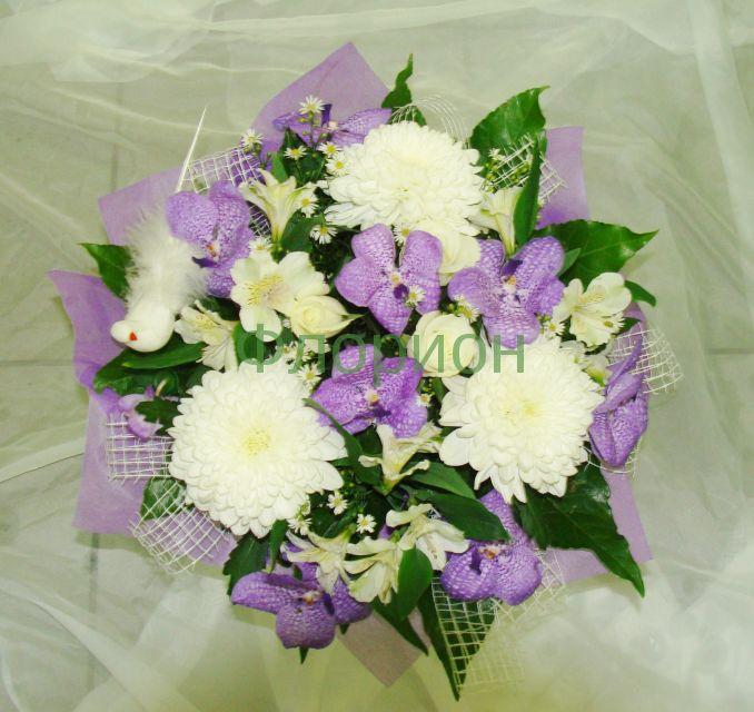 2012г. Букет на день рождения девочке. С орхидеей, хризантемой. Цвет: Бело-сиреневый. Размер (35х35х35) нц 2015