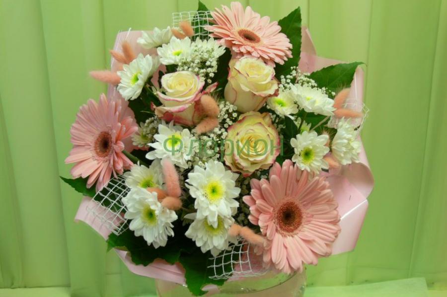 2011г. Букет ко дню рождения. Состав: Розы, герберы, хризантемы. Цвет: Розово-кремовый. Размер (35х35х45)