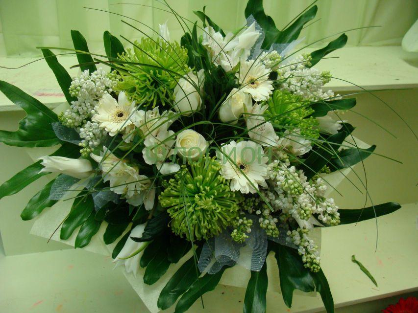 2010г. Букет для новорожденного. Дорогому малышу на радость. Состав: Герберы, роза, сирень. Цвет: Кремово-зеленый. Размер (35х45х45) нц 2015