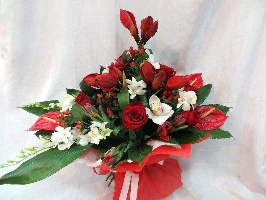 2014г. Букет на торжественный день рождения. Состав: Амариллис, антуриум, роза, орхидея. Цвет: Красно-белый. Размер (65х55х65). Прекрасный подарок к празднику. нц 2015