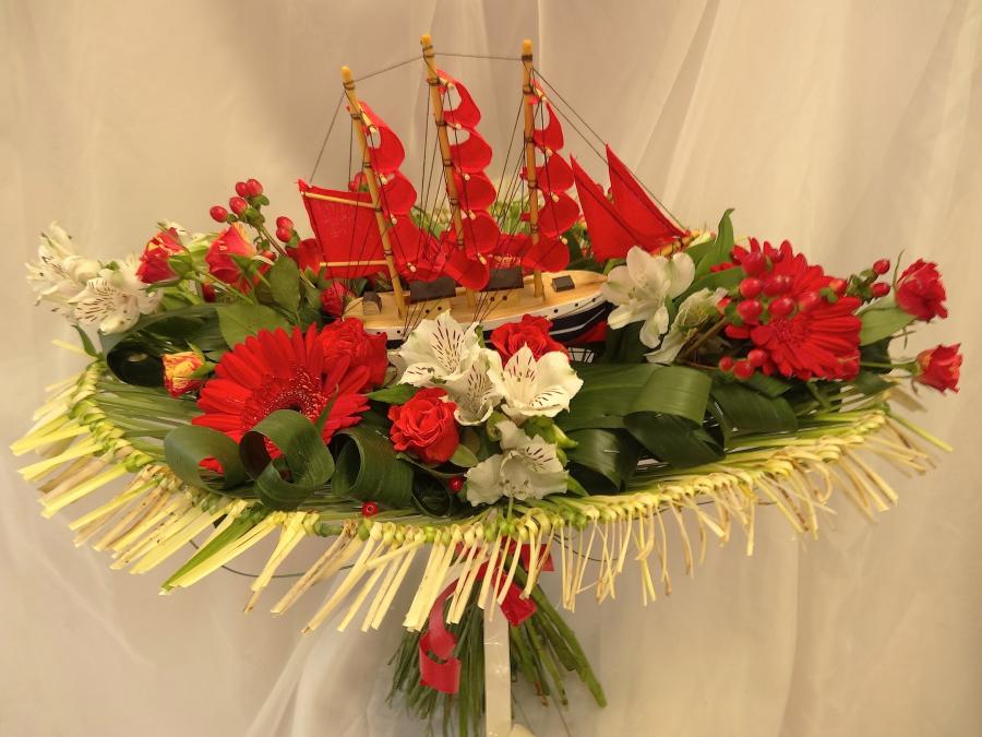2016г. Букет на юбилей. Форма корабль. Состав: Роза, альстромерия, гербера. Цвет: Красно-зеленый. Размер (55х30х45) 2022