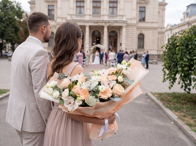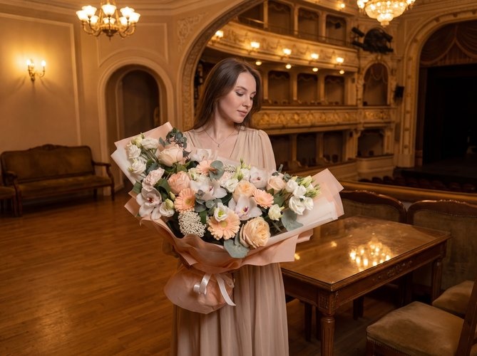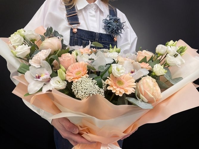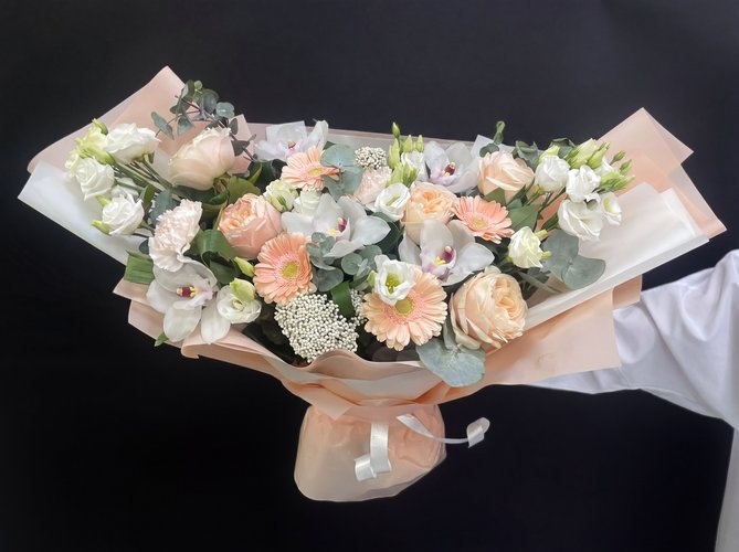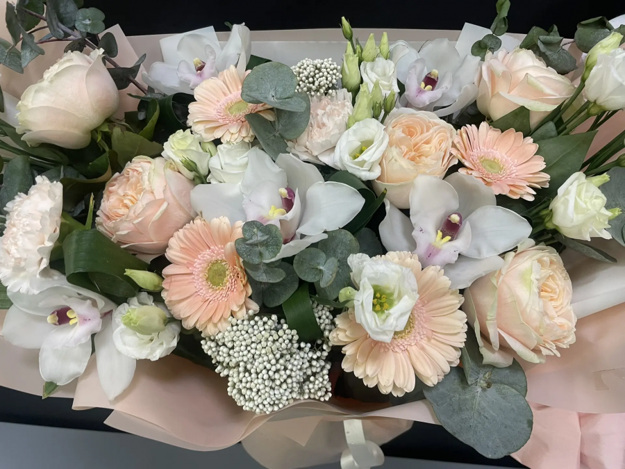 2026 г. Букет для любимой. Форма овальная лодочка. Состав: белая орхидея, кремовая роза, бежевые герберы, белый диантус, эустома, эвкалипт. Это палитра романтики и нежности, которая не знает срока давности. «Навеки твой» — букет из благородных пастельных оттенков, где каждый цветок шепчет о верности. Белая орхидея говорит о восхищении, кремовая роза — о трепете, а бежевые герберы дарят тепло. Белый диантус и воздушная эустома добавляют лёгкости, а ароматный эвкалипт окутывает свежестью. Букет подходит для предложения руки и сердца, годовщины или просто для того, чтобы сказать главные слова без лишнего шума. Подходит для свадебного оформления и в качестве оформления на торжественные мероприятия. Живые цветы сохраняют красоту до двух недель.