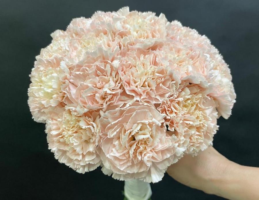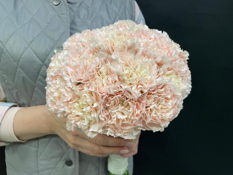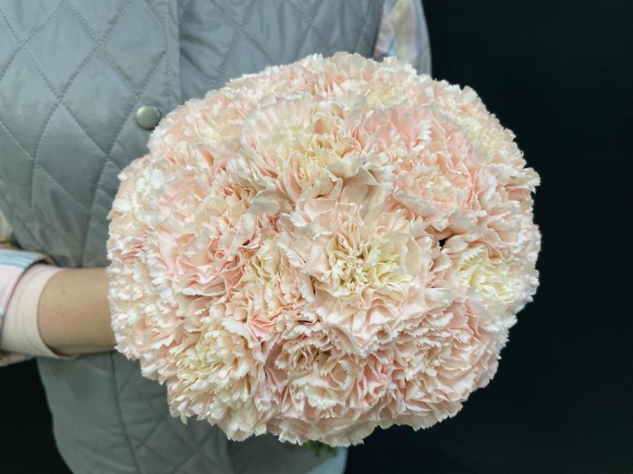 2025г. Свадебный букет из живых цветов. Круглый. Состав: Гвоздика. Цвет: Кремовый. Размер (20х20х25). Украсит белого или кремового цвета, свадебное платье невесты.