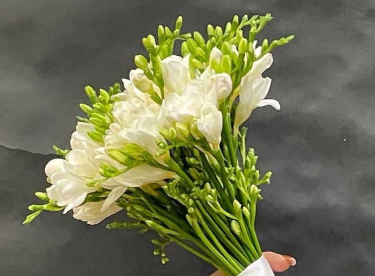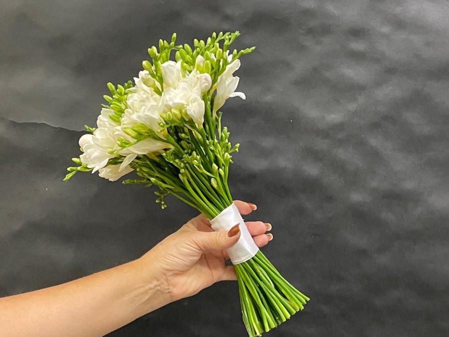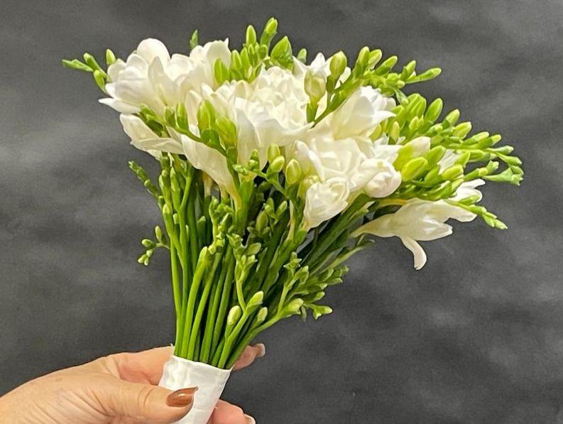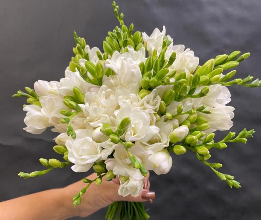 2025г. Свадебный букет из фрезий для невесты. Круглый. Состав: 35 фрезия. Цвет: Белый. Размер (23х23х35)