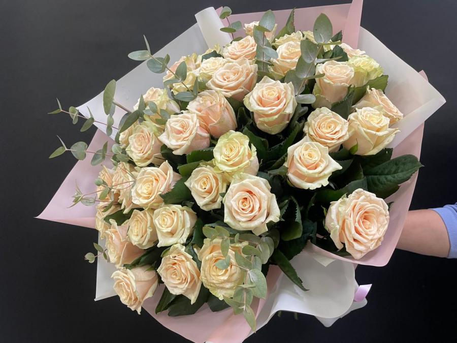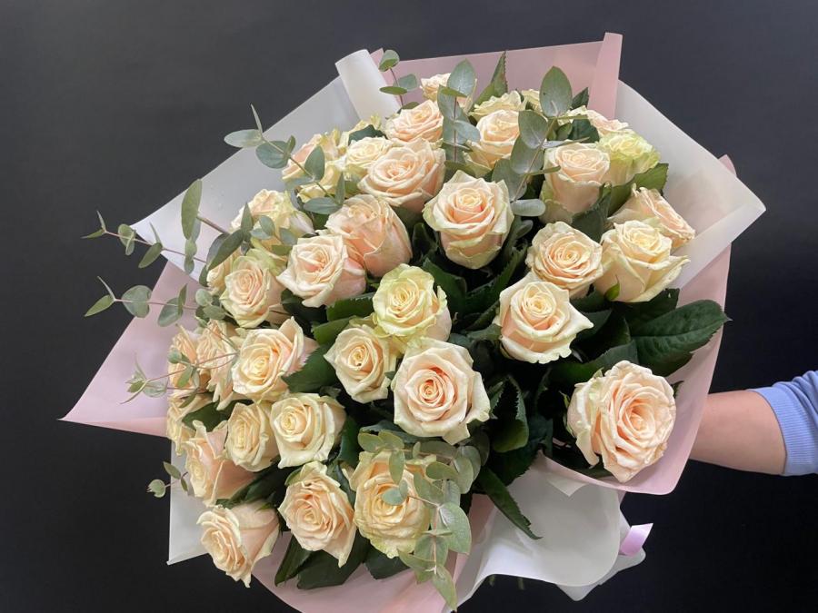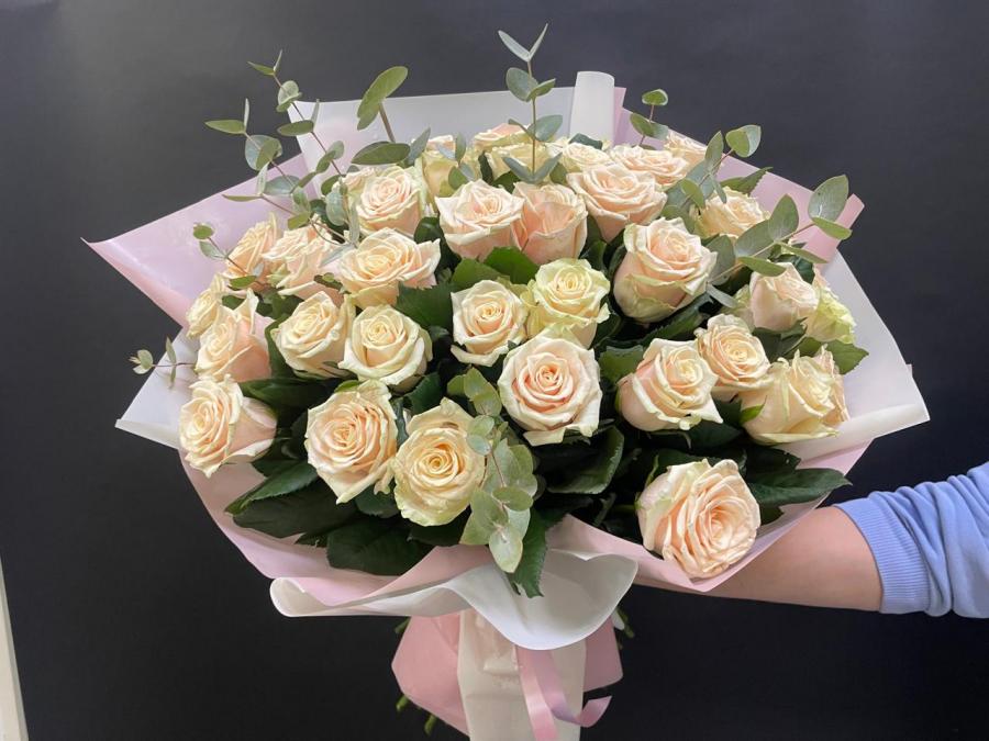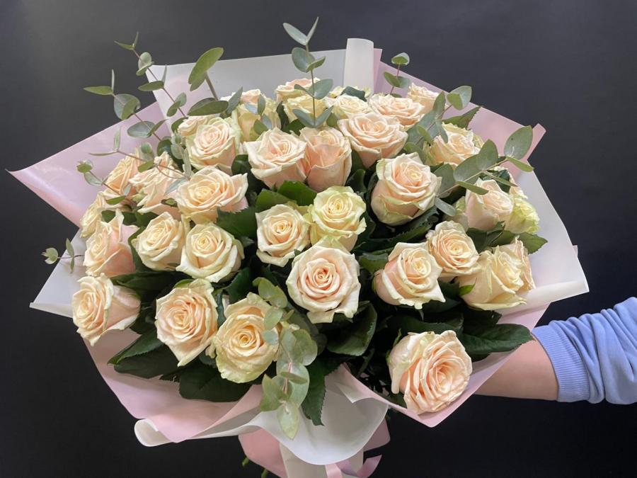 2025г. Букет из роз. Форма круглая. Цветы любимой, девушке, маме. Состав: 39 роз. Размер (55х55х65). Цвет: Кремовый