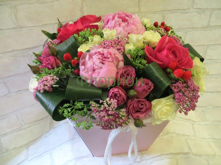 2018г. Композиция на день рождения для любимой, из живых цветов в коробке. Форма: Призма . Состав: Пион, роза, гиперикум. Цвет: Красный с розовым. Размер (39х35х40)