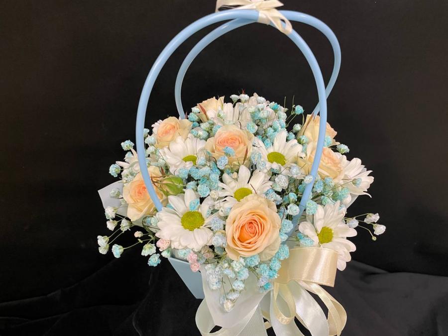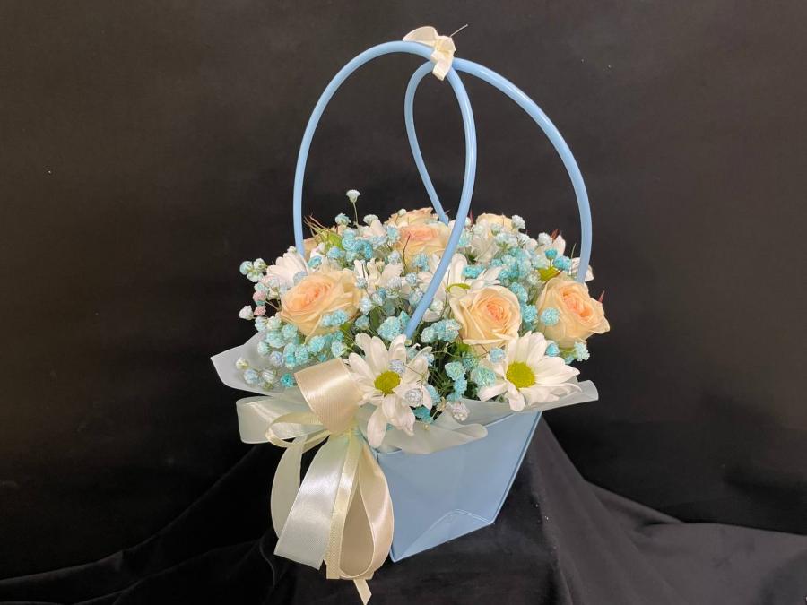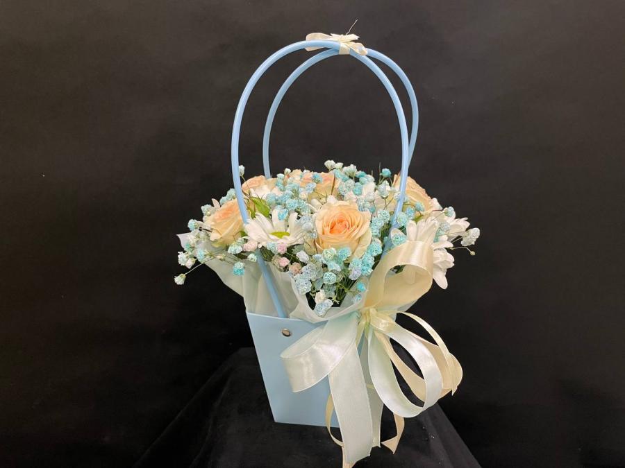 2026г. Цветы в сумочке. Состав: Роза, хризантема, гипсофила. Цвет: Кремовый с белым. Размер (25х25х35)