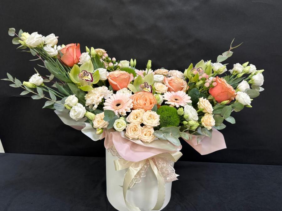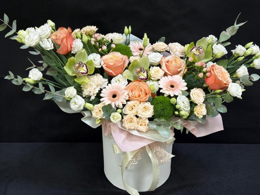 2025г. Композиция из цветов для любимой в коробке. На день рождения. Цветы кому: Любимой, девушке, маме, бабушке, ребенку. Состав: Гербера, эустома, орхидея, роза, диантус, роза кустовая, эвкалипт. Цвет: Кремовый с белым и зеленым. Размер (70х45х55)
