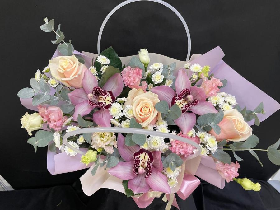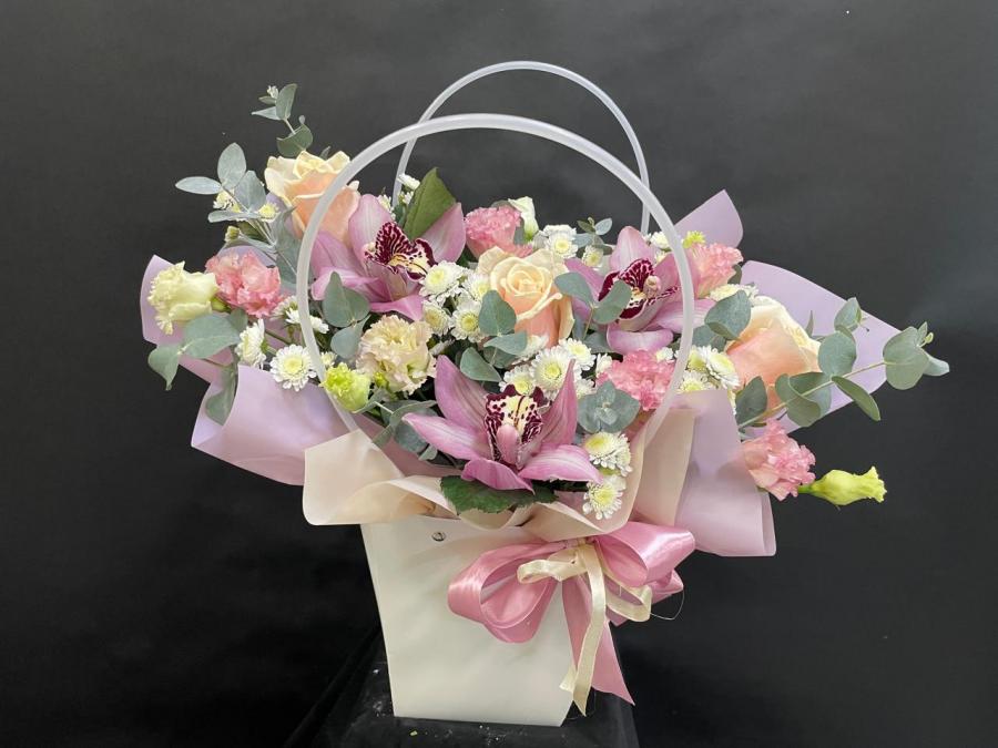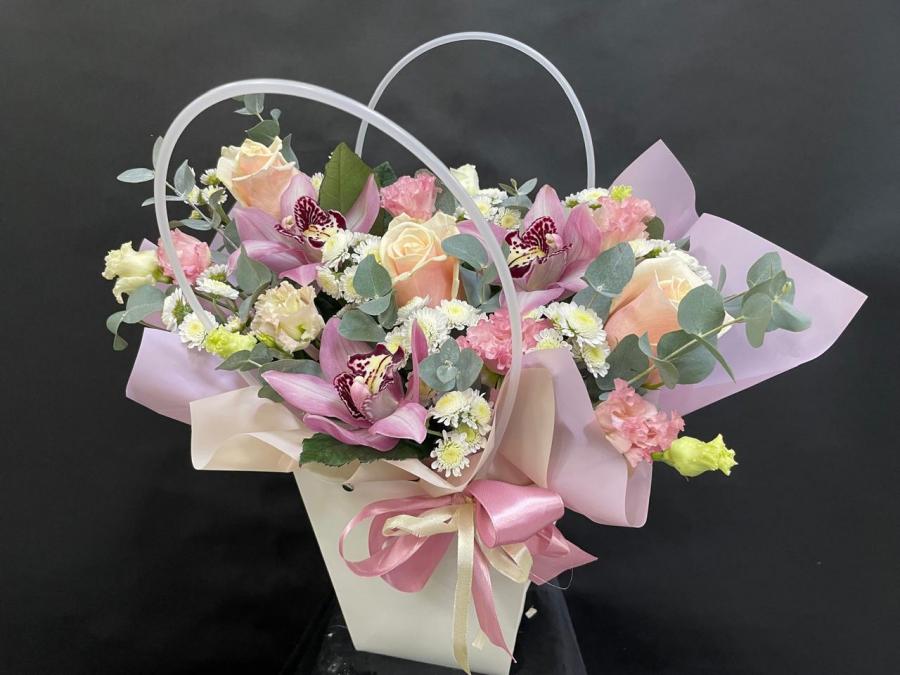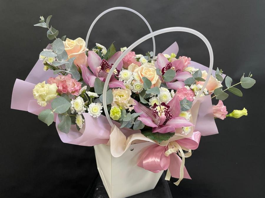 2025г. Композиция из цветов для любимой в сумочке. На день рождения. Цветы кому: Любимой, девушке, маме, бабушке, ребенку. Состав: Роза, лизиантус, орхидея, хризантема, эвкалипт. Цвет: Белый с кремовым и розовым. Размер (35х25х42)