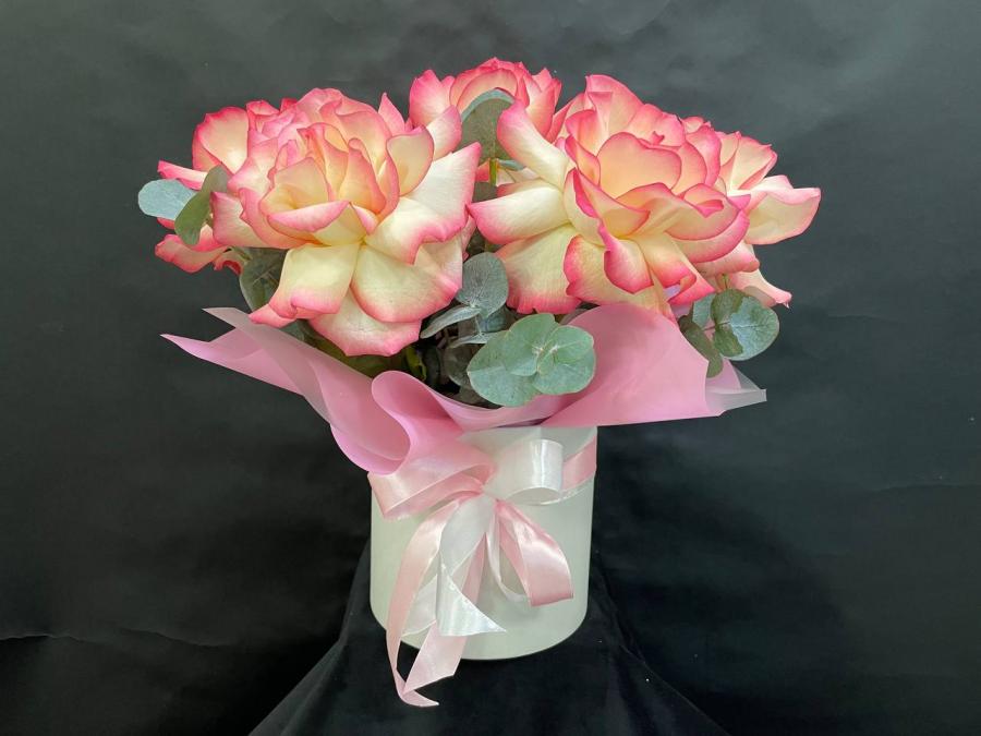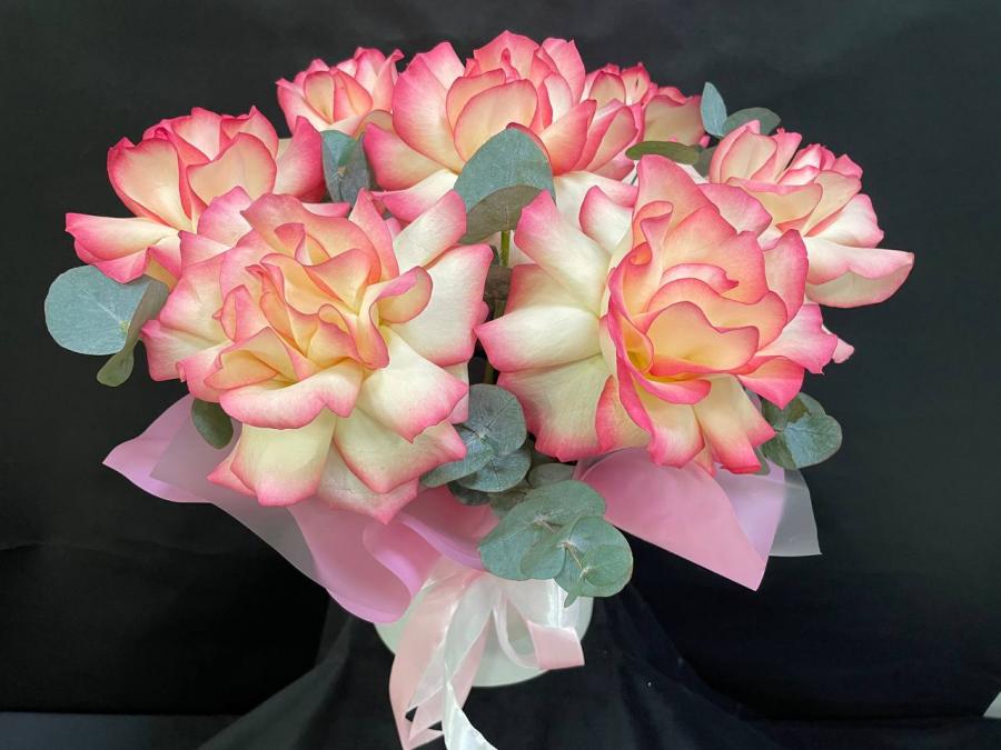 2026г. Композиция из живых цветов в шляпной коробке. Состав: 7 французских роз. Цвет: Оранжевый с белым. Размер (35х35х40)
