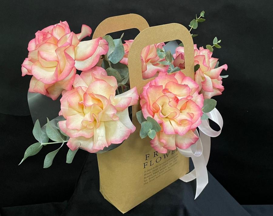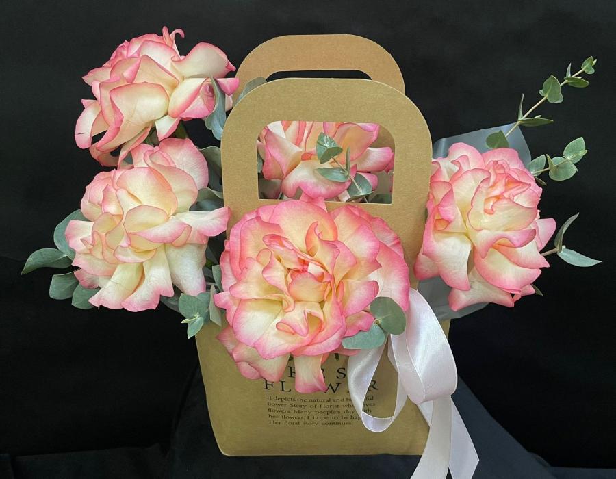 2025г. Композиция из цветов для любимой в сумочке. На день рождения. Цветы кому: Любимой, девушке, маме, бабушке, ребенку. Состав: 5 Французские розы , эустома. Цвет: Оранжево желтый. Размер (33х25х30)