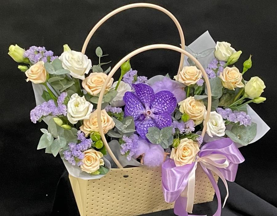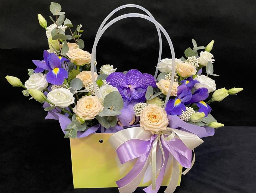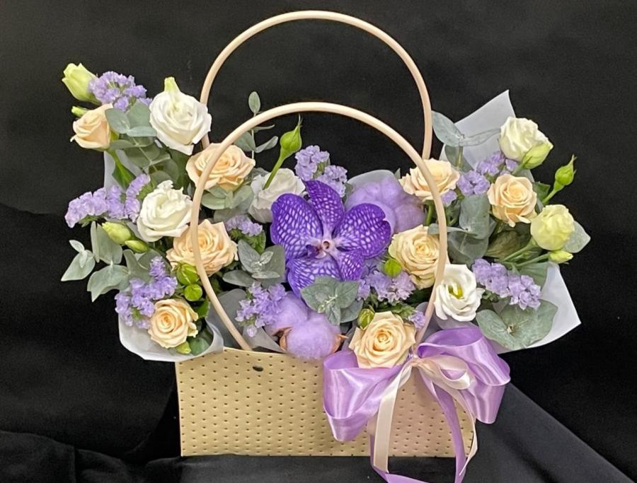 2025г. Композиция из цветов в коробке. Цветы в сумочке на день рождения. Маме и любимой. Состав: Роза кустовая, орхидея ванда, эустома, статица, хлопок, эвкалипт. Цвет: Бело кремовый с фиолетовым. Размер (50х25х45)