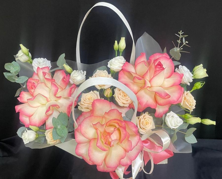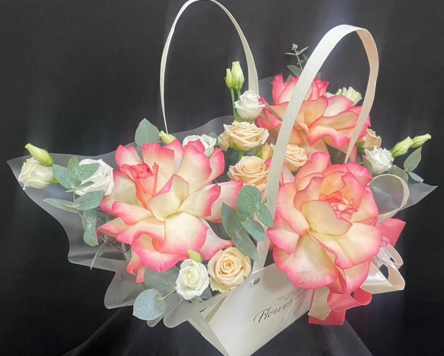 2025г. Композиция из цветов для любимой в сумочке. На день рождения. Цветы кому: Любимой, девушке, маме, бабушке, ребенку. Состав: 3 Французские розы, роза кустовая, эустома. Цвет: Оранжево желтый с кремовым. Размер (33х25х30)