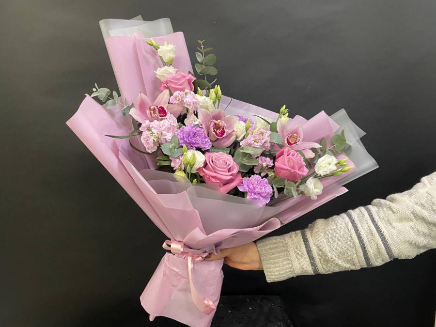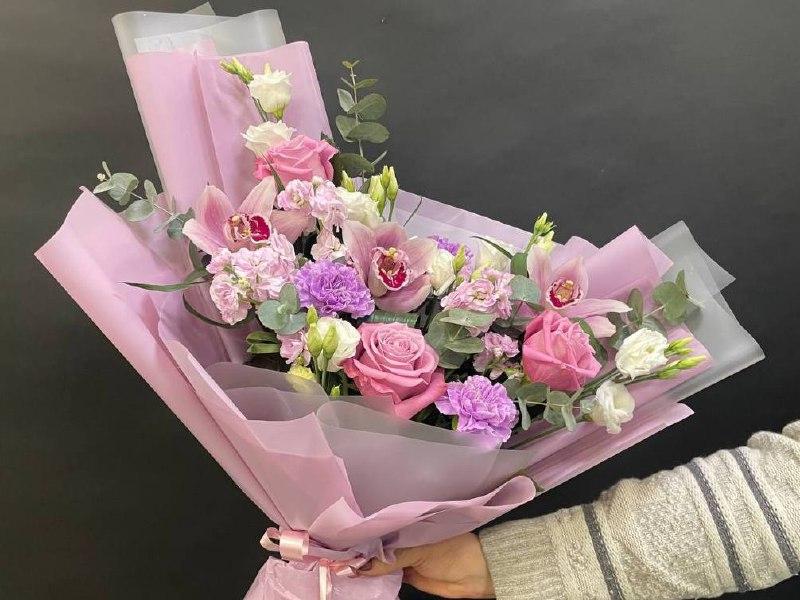 2026 г. Букет для любимой. Форма овальная лодочка. Состав: Орхидея, роза, гвоздика, матиола, эустома, эвкалипт. Цвет: Розовый. Размер (55х25х60)