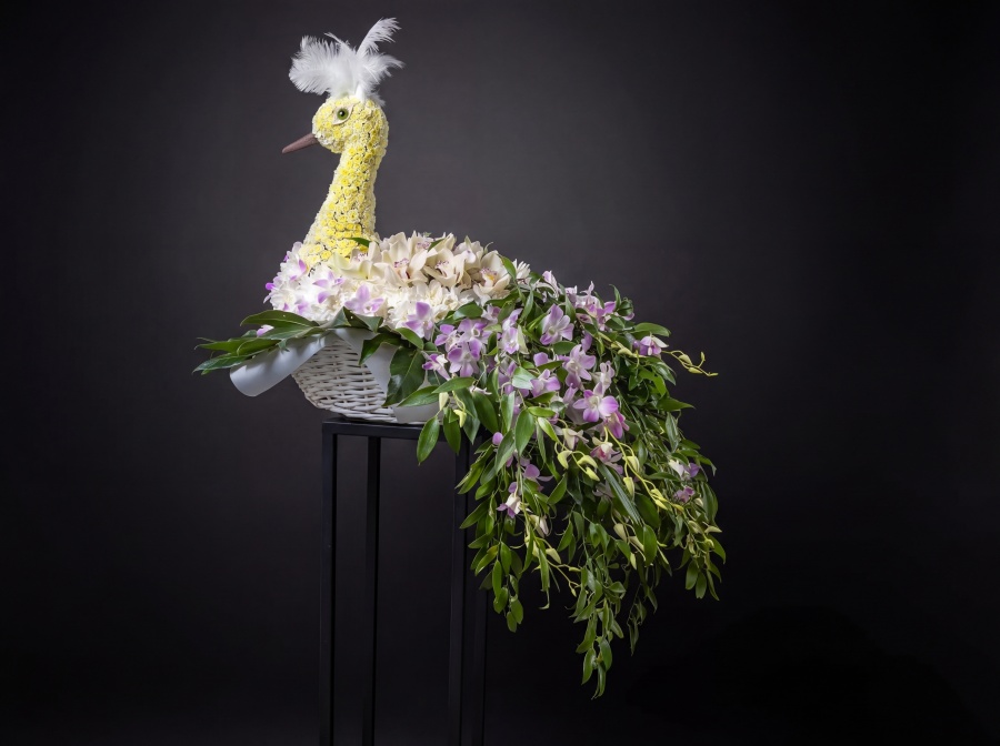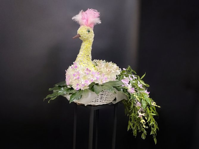 2026г. Композиция из живых цветов. Форма: Птица в корзине. Состав: хризантема, орхидея, дендробиум, лист феникса. Цвет: Белый с розовым. Вес 7,0 кг. Это не просто цветочная композиция - это живой оберег, воплощённый в изящной форме. «Птица счастья» — рукотворное чудо из нежных хризантем, благородных дендробиумов и экзотических орхидей. Каждый лепесток укладывается вручную, чтобы создать силуэт сказочной птицы — лёгкой, парящей, наполненной теплом. Роскошь живых цветов здесь соединяется с искусством флористической скульптуры. Такая птица не улетит, но принесёт в дом удачу, любовь и ощущение праздника. Она словно шепчет: «Пусть твоя жизнь станет ярче и счастливее». Эта композиция идеально подходит: На свадьбу — как символ семейного счастья и верности, на рождение ребёнка — живой подарок с пожеланием лёгкой судьбы, на день рождения близкого человека — для создания особенного настроения, как интерьерный подарок в дом или офис — статусная и редкая композиция, на выписку из роддома — нежный и оригинальный сюрприз для мамы и малыша. Композиция из живых цветов сохраняет свежесть до 14 дней при правильном уходе. Изготавливается вручную под заказ.