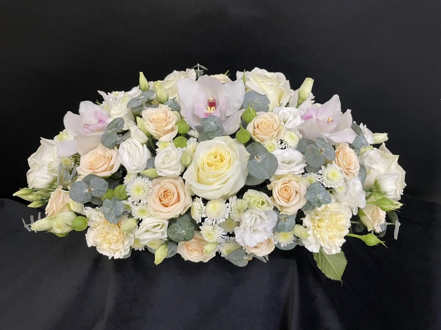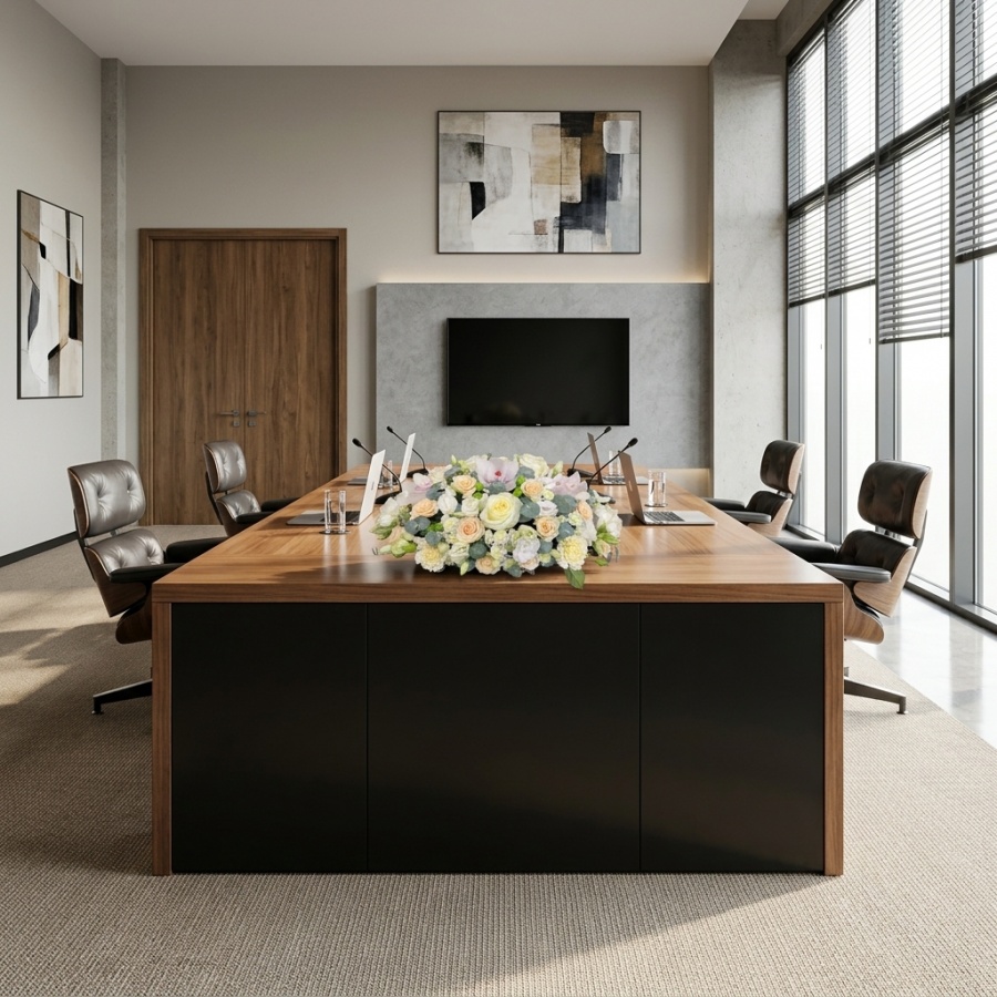 2026г. Цветы на стол для совещаний, на стол руководителя, на стол переговоров, на ресепшн. Масштабная настольная композиция из живых цветов в корпоративных оттенках с чёткими графичными линиями становится визуальным якорем пространства добавляя положительные эмоции каждый день. Состав: Орхидея, роза, роза кустовая, эустома, гвоздика, эвкалипт. Цвет: Белый кремовый розовый с зеленым. Размер (45х25х18)