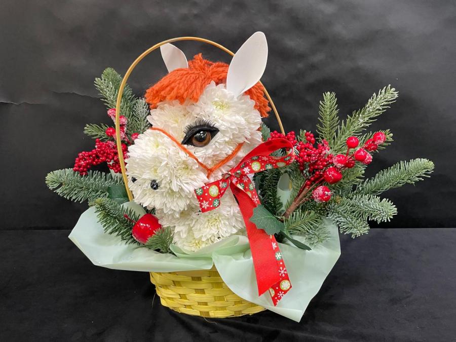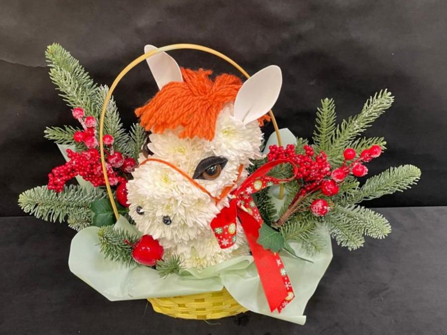 2025г. Новогодние композиции из нобилиса. Лошадка из живых цветов корзине. Знак зодиака "Огненая лошадь". Состав: Живая ель нобисис, хризантема, гипсофила. Цвет: Белый, зеленый, красный. Размер (40х30х40)