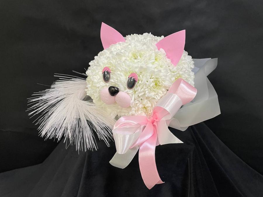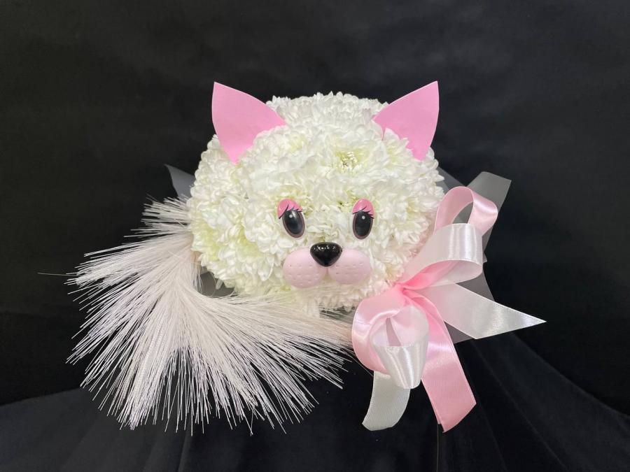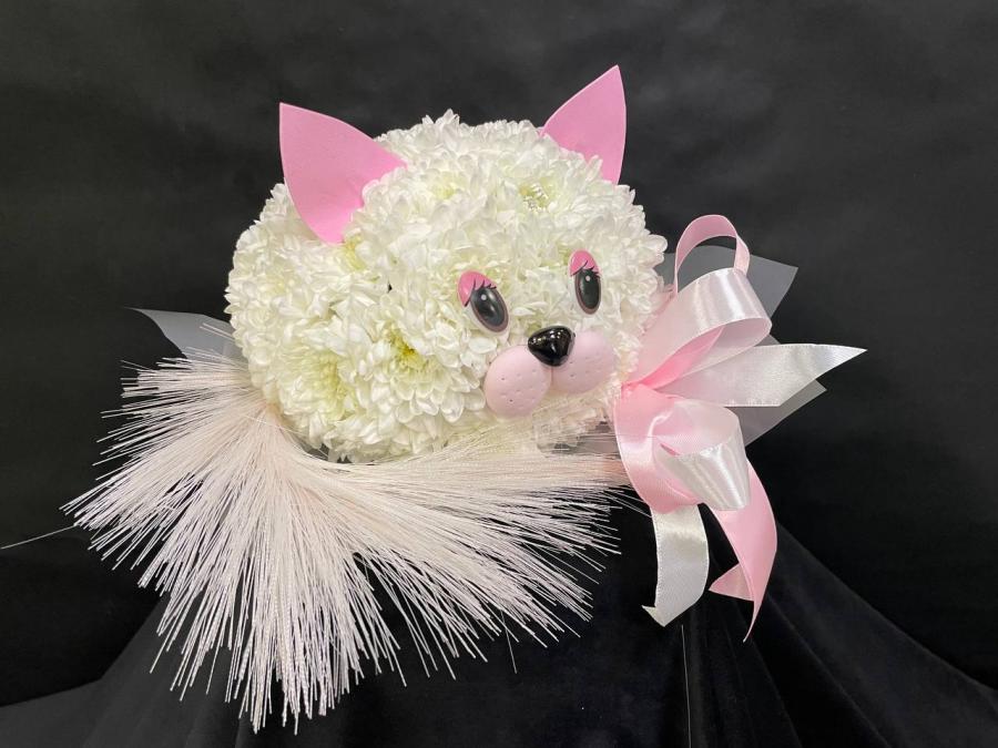 2026г. Игрушка из живых цветов. Котенок из цветов. Состав: Хризантема. Цвет: Белый с розовым. Размер (20х20х20)