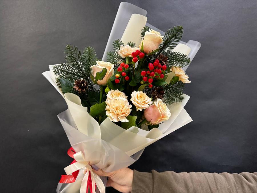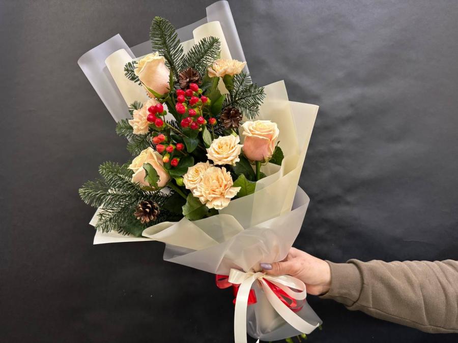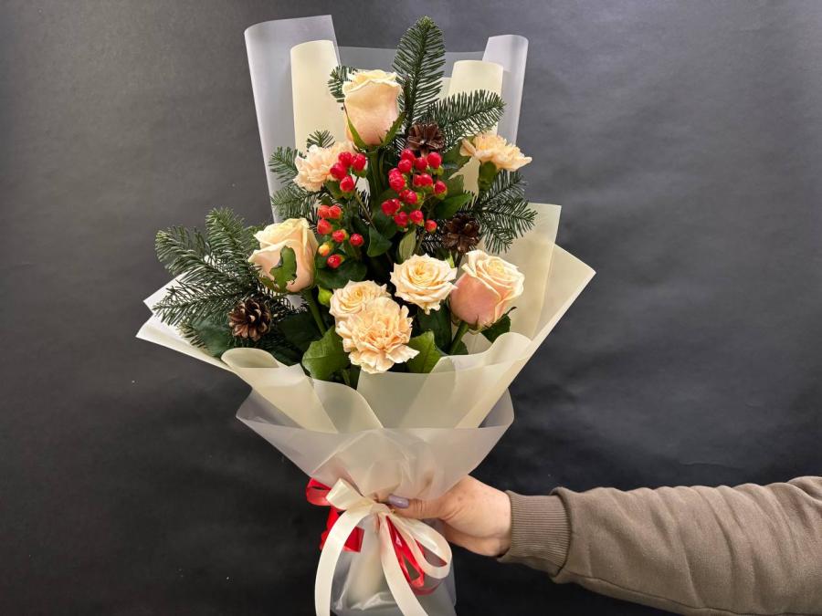 2025 г. Букет с живыми ветками канадской ели «Нобилис», розами, диантусом и гиперикумом. Цвет: зелёный, кремовый. Размер: д. - 40 см., в. - 50 см., ш. - 30 см.