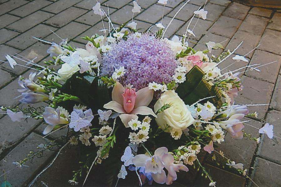 2010г. С живыми цветами. Состав: Розы, орхидеи, фрезии, хризантемы, декоративный лук.