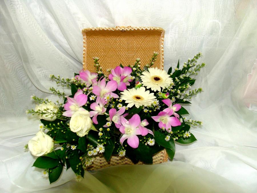 2010г. Композиция из живых цветов в соломенной коробке. Состав: Роза, гербера, дендробиум. Цвет: Сиренево-белый. Размер (35х25х30)