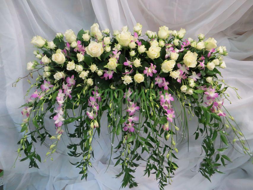 2012г. Композиция из живых цветов. Бело-золотая свадьба. Свадебное оформление стола цветами.