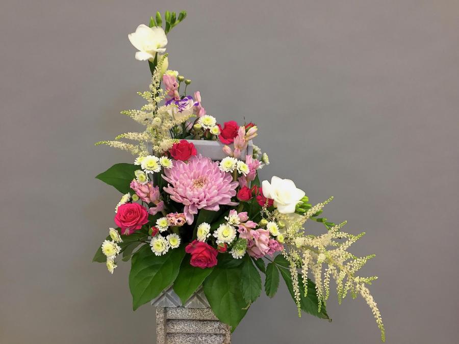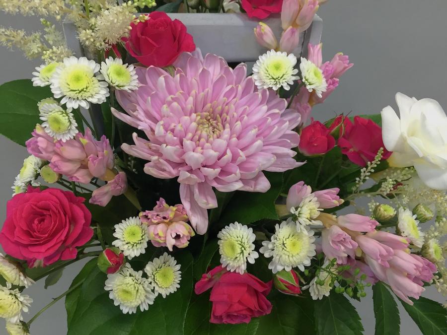 2020г. Композиция из цветов в деревянном ящике. Состав: Роза, фрезия, астильба, хризантема. Цвет: Красно-розовый с белым. Размер (35х35х45)