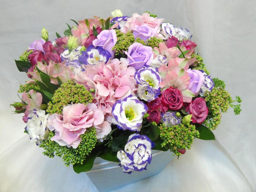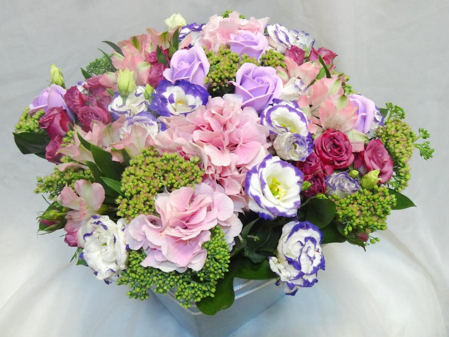 2019г. Композиция из живых цветов в коробке. Форма: Квадратная. Состав: Роза мыло, гортензия, роза кустовая, эустома, седум. Цвет: Сине-розовый с салатовым. Размер (35х33х30)