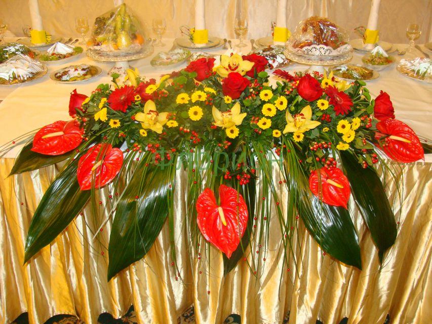 2011г. Композиция из живых цветов на стол молодоженов. Размер (120х45х25). Ресторан "Принцесса". Красно-золотая свадьба. Нц 2015