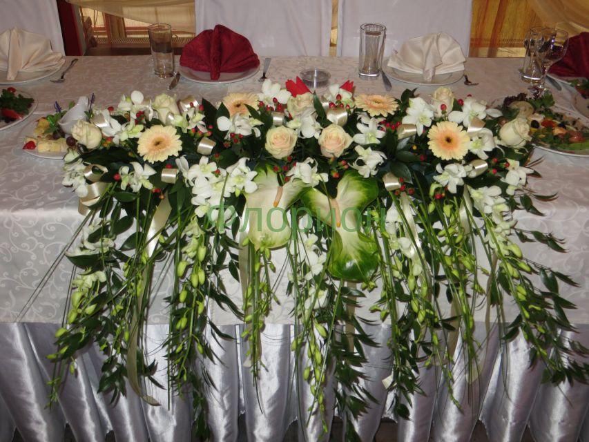 2012г. Композиция из живых цветов. Оформление свадебного стола. Состав: Роза, гербера, антуриум, дендробиум. Цвет: Кремовый с зеленым.