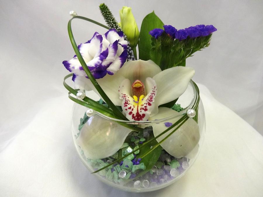 2016г. Композиция из живых цветов. Состав: Орхидея, эустома, статица. Цвет: Сине-белый с зеленым фоном. Размер (10х10х15)