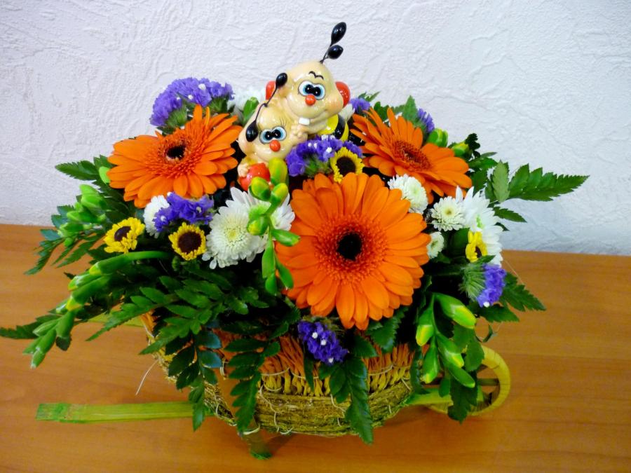2010г. Композиция с живыми цветами. Состав: Гербера, статица, фрезия, хризантема. Цвет: Оранжевый. Размер (25х15х15)