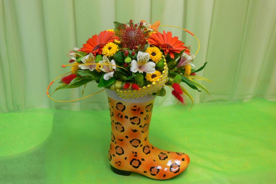 2010г. Композиция с живыми цветами. Состав: Роза, гербера, леукоспермум. Цвет: Оранжевый. Ваза-сапожок
